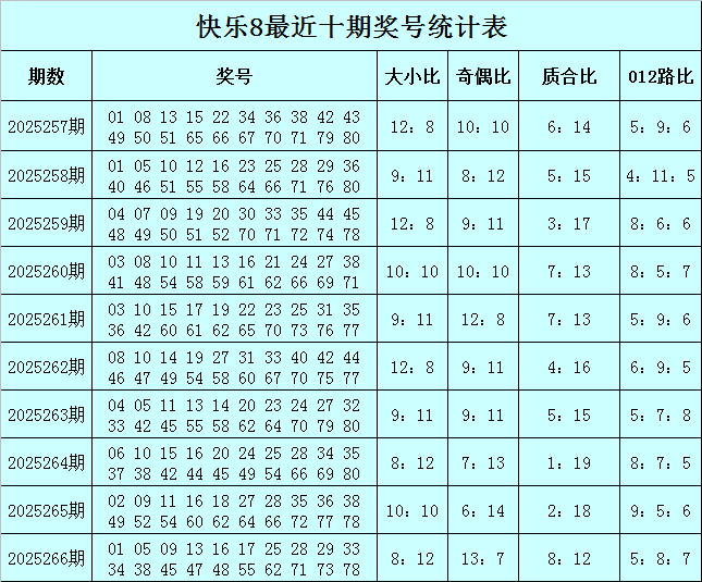 福彩状态8第2025266期开奖转头:01 05 09 13 16 17 25 28 29 33 34 38 45 47 48 55 62 71 73 78,其中奖号大小比开出8:12体育录像/图片,奇偶比开出13:7,质合比开出8:12,012路比开出5:8:7。